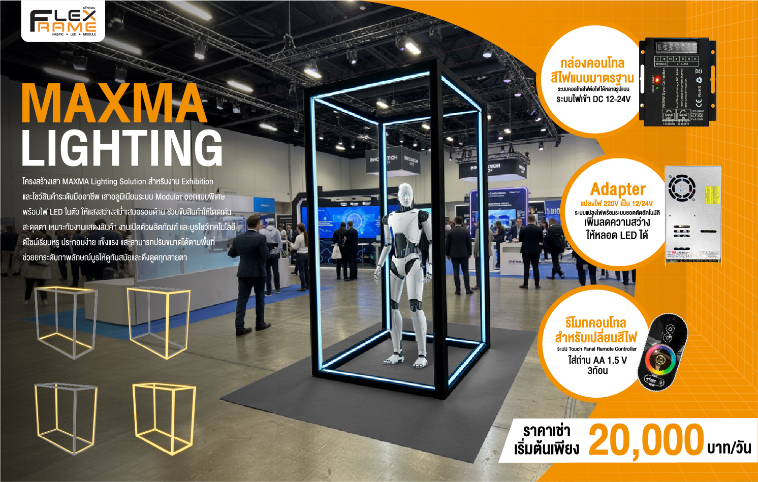 MAXMA Lighting คือโครงสร้างอะลูมิเนียมรุ่นใหม่จาก Flexframe ที่มาพร้อมระบบไฟ LED รอบทิศทาง สามารถล็อกการเปิดเฉพาะจุดหรือส่วงทั้งโครงได้ เหมาะสำหรับงาน Booth, Exhibition และ Seminar ที่ต้องการความโดดเด่นและความหรูหราในดีไซน์เดียว